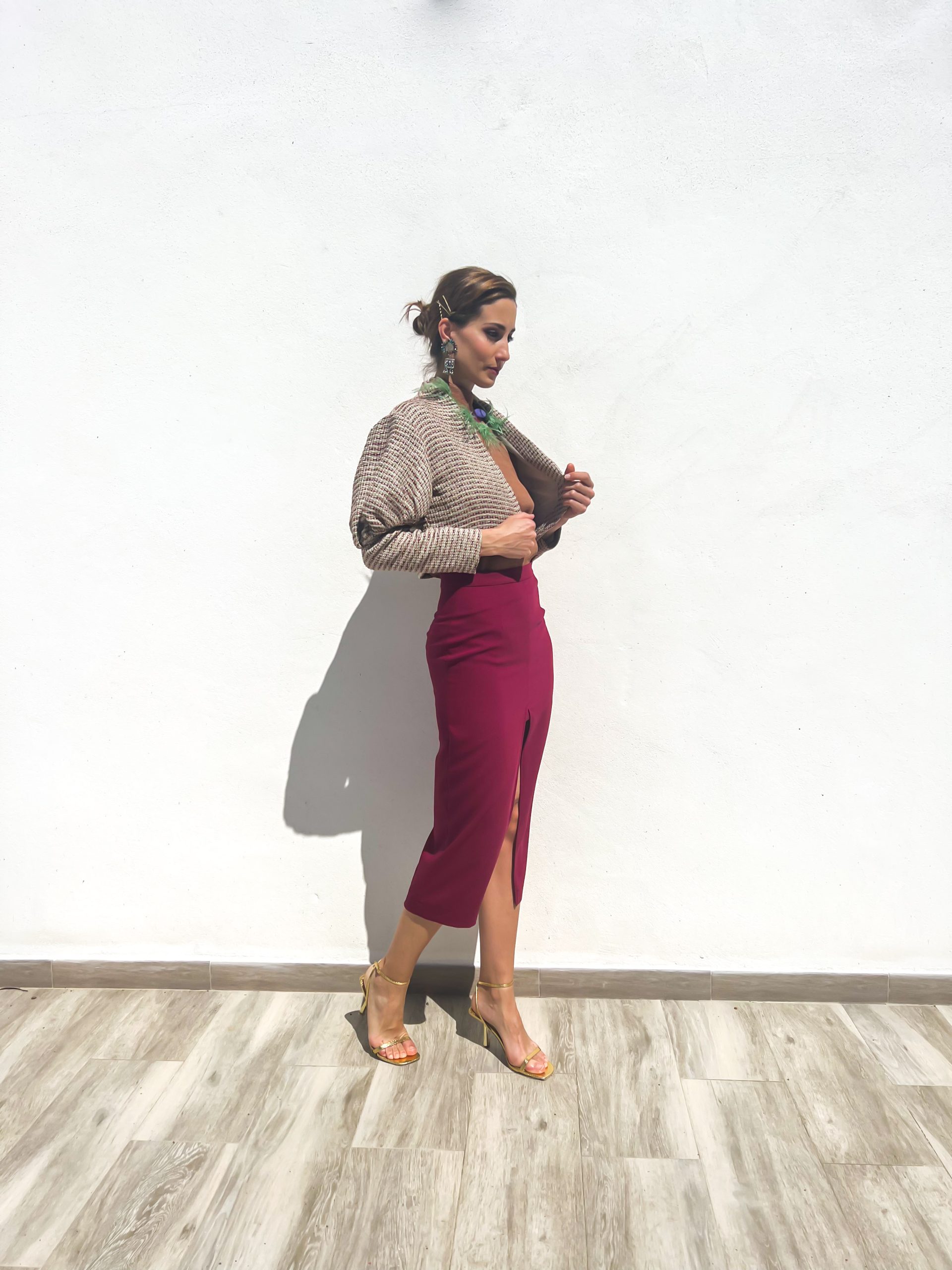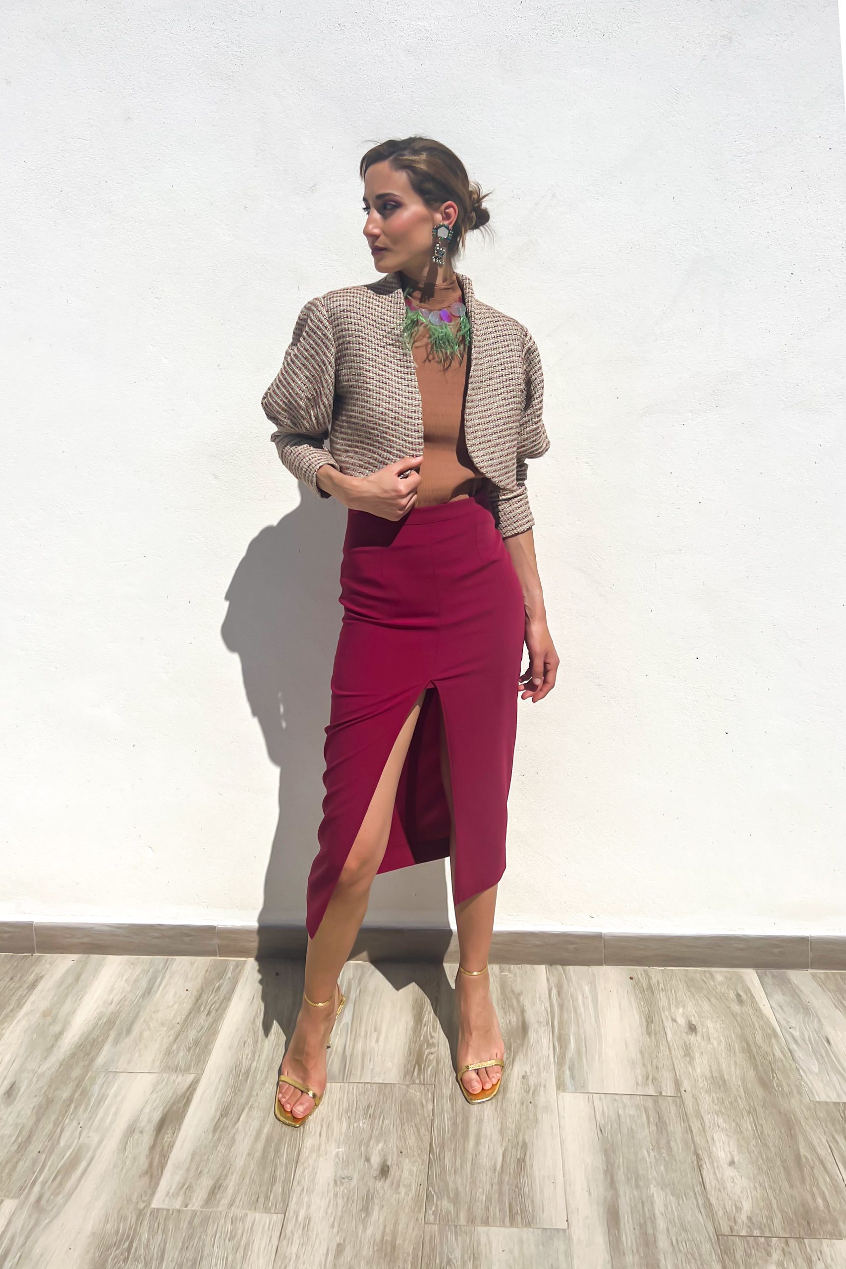Chaqueta cropped en tweed con manga abullonada en la parte superior y recta en la inferior, cello chimenea. Sin botones.