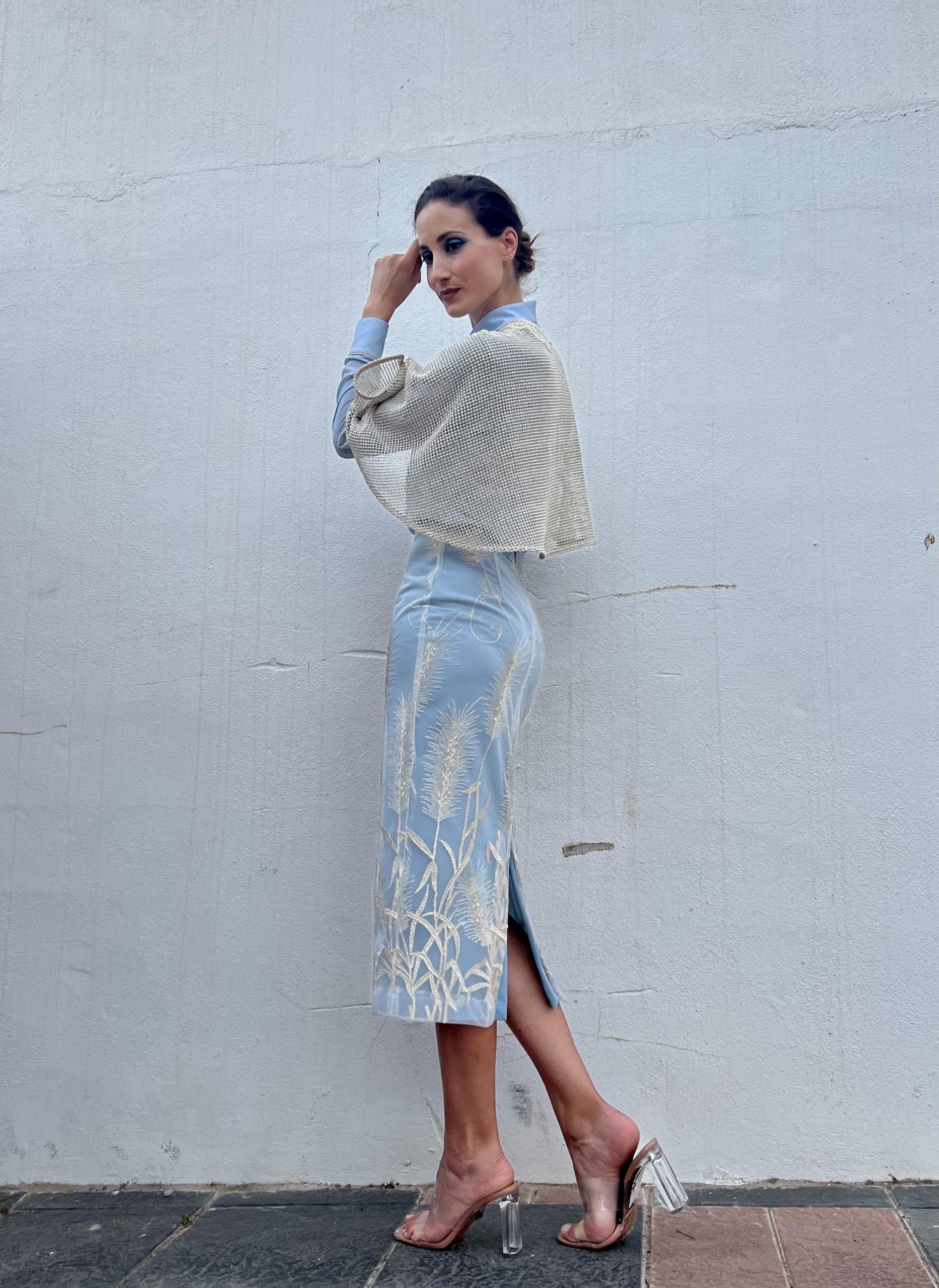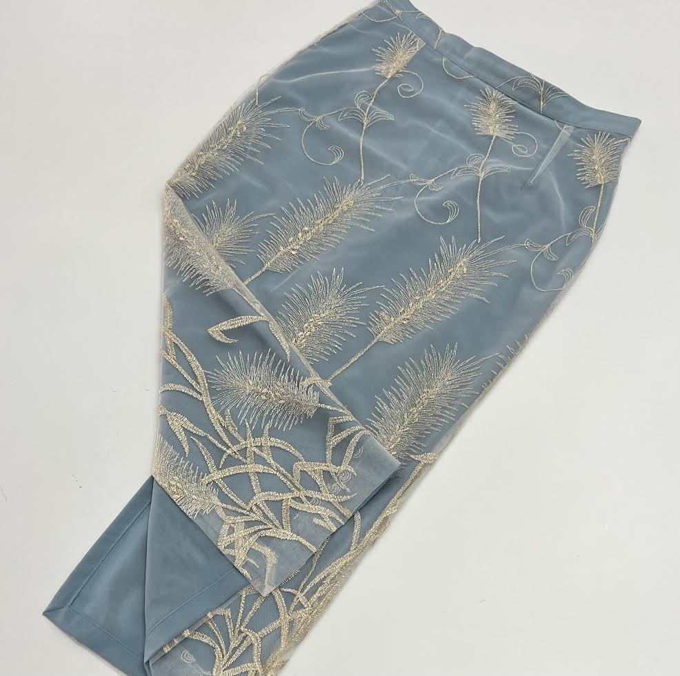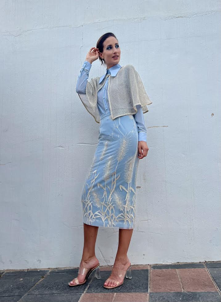 Falda entubada en largo midi y color azul ,con tejido de tul blanco bordado a contraste.
