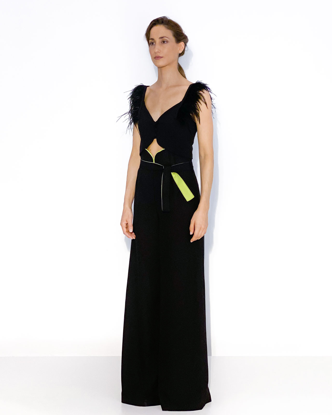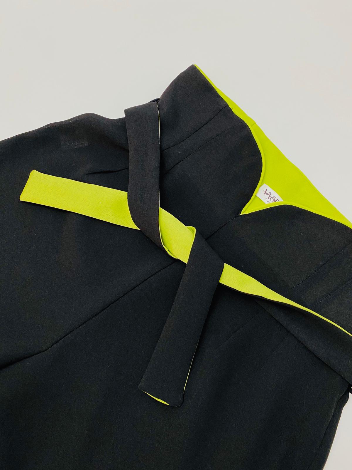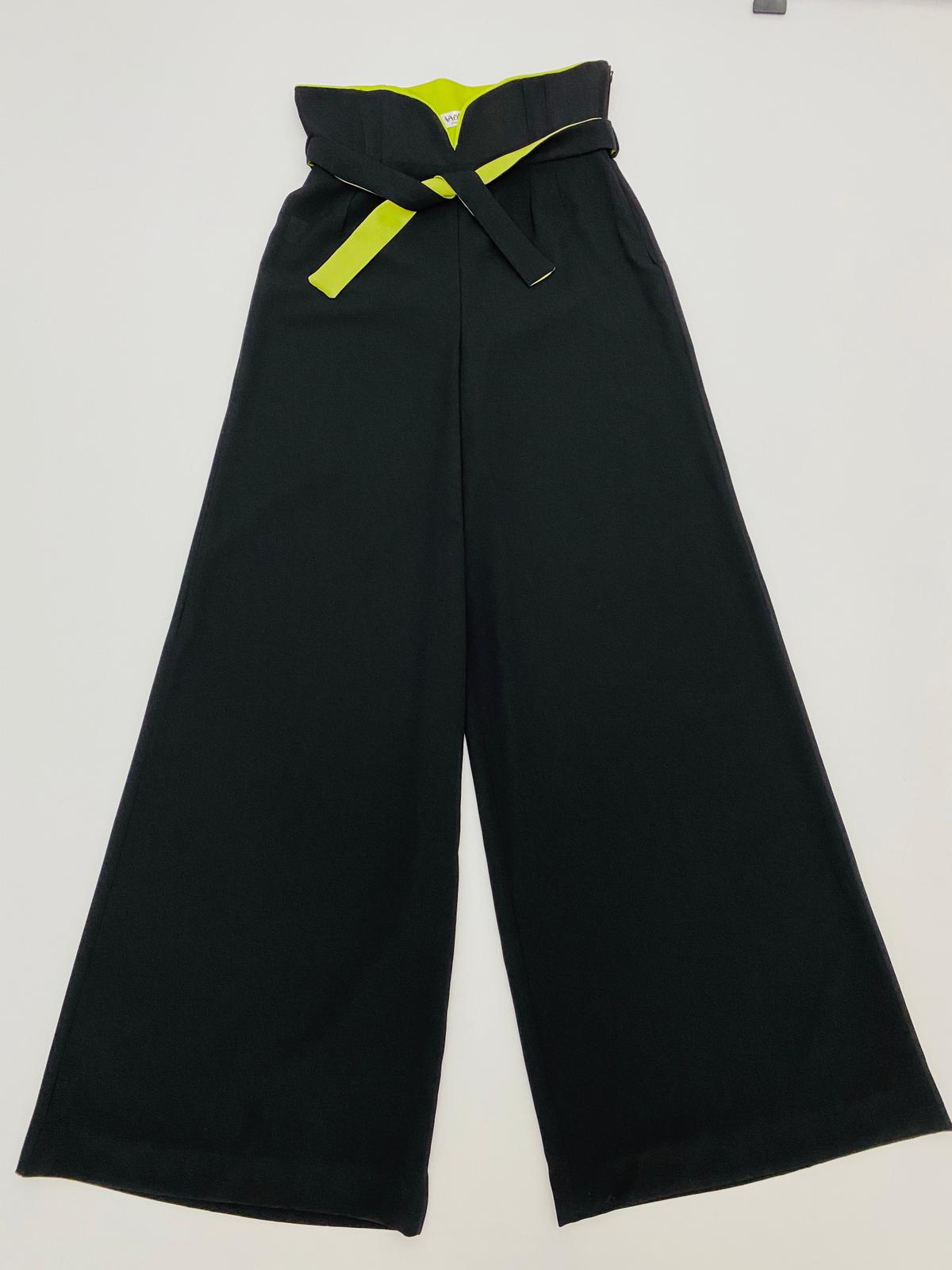 Pantalón negro corte palazzo con cintura alta forrada en color verde ,cremallera lateral y cinturón en el mismo tejido