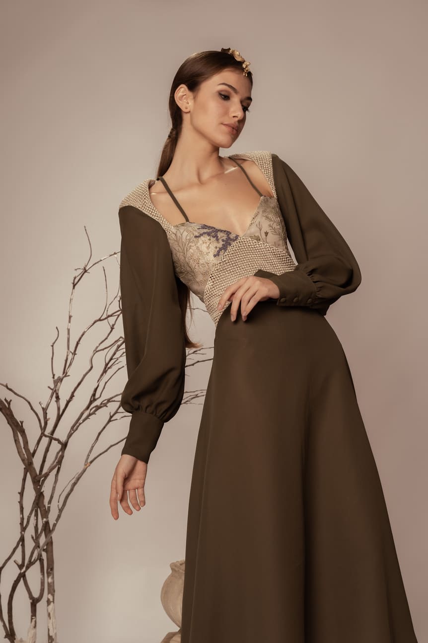 vestido largo midi con vuelo, en color verde,combinando tres tejidos en la parte de arriba,gasa estampada y red dorada con la espalda abierta y cremallera trasera.