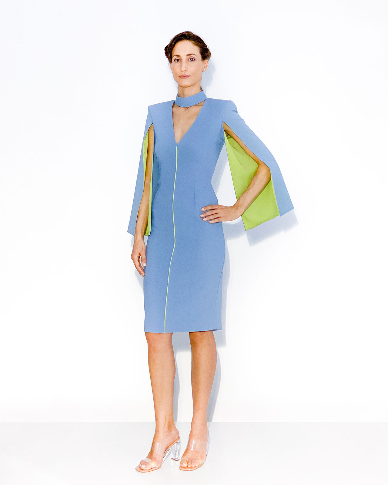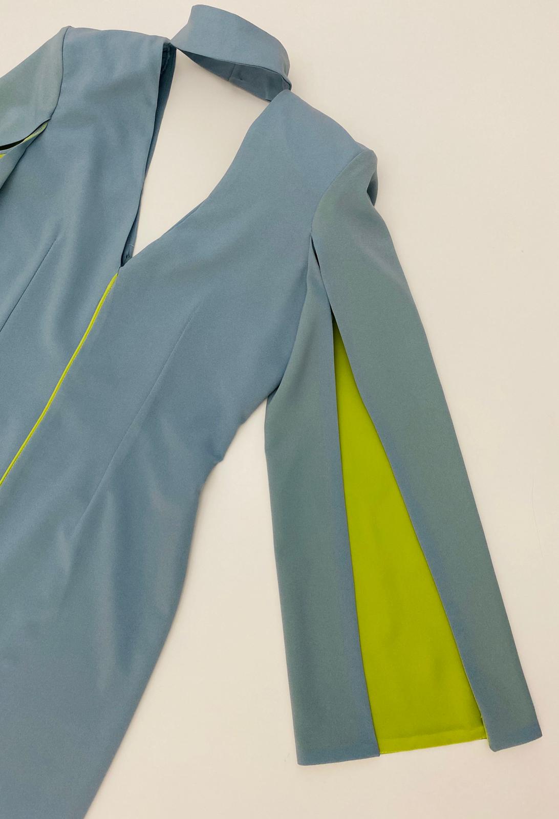 Vestido azul entubado, largo midi con mangas largas abiertas y tela a contraste verde pistacho.